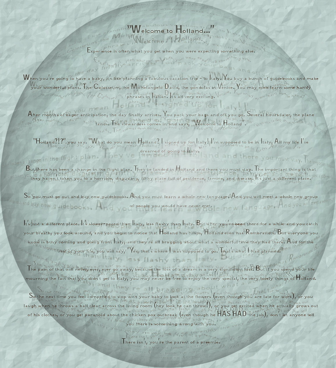 After months of eager anticipation, the day finally arrives. You pack your bags and off you go. Several hours later, the plane lands. The stewardess comes in and says, "Welcome to Holland."
